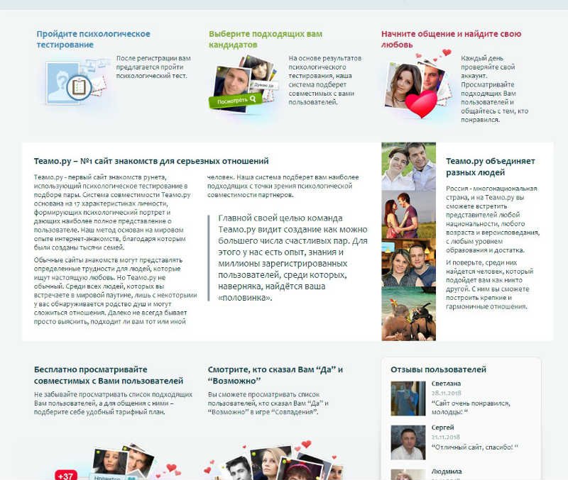 Kaže se da surfanje po prostranstvima "Teama" ne umara. Činjenica je da se stranica pozicionira kao platforma za stvaranje snažnih prijateljstava, ljubavi, pa čak i obiteljskih veza, zbog čega je pokušaj neovlaštenog pristupa korisnicima bio što teži. Kao rezultat toga, ovdje se praktično ne nalaze opscene ponude, budući da plaćeni sustav i aktivna umjerenost isključuju one koji se registriraju bez ozbiljnih namjera i šalju poruke uvredljive prirode. U takvim okolnostima, napraviti obećavajuće poznanstvo je mnogo lakše i brže.
