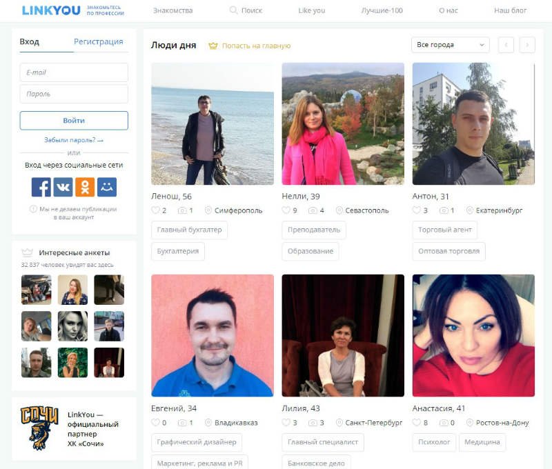 Ono što odmah zadovoljava stranicu je ponuda gostujućeg ulaza - bez registracije, možete pogledati sučelje i značajke. Druga značajka usluge je neobičan način susreta s ljudima na temelju njihove profesije. Iskustvo pokazuje da ova taktika uspješno funkcionira - barem uzeti statistiku uredskih romansa. Stranica je mlada, djeluje nešto više od dvije godine, a prema nekim medijima, uspjela je ući na popis najboljih.Publika je još uvijek mala, ali većina korisnika aktivno je i traži drugu polovicu za zajednički život i brak.