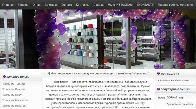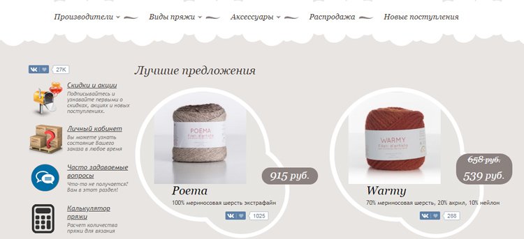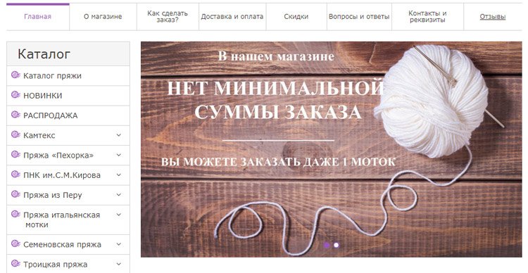 Trgovina nije baka jedna od najpogodnijih i razumljivih stranica. Pređa je podijeljena u kategorije, uključujući cijenu, proizvođač, snimke, vrstu vlakana, boju i metodu pletenja. Tvrtka se pobrinula za dizajn svakog proizvoda, fotografija savršeno prenosi teksturu niti. Većina pozicija na stranicama je na lageru, ali broj nije naveden, morat ćete se obratiti upravitelju. Tvrtka prodaje rijetko, ali se izdaje mali dio s dionicama. Tvrtka održava kontakt s kupcima, redovito ažurira informacije na društvenim mrežama i odgovara na recenzije.