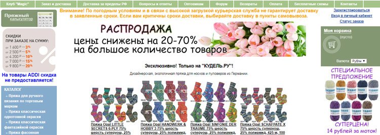Unatoč neprimjetnom izgledu stranice, Kudel je stekao povjerenje i priznanje kupaca. To ljudi najčešće traže u mreži, a korisnici organiziraju grupne kupnje u trgovini. Katalog je podijeljen u kategorije prema namjeni pređe: klasična, pahuljasta, viskozna itd.Osim toga, možete sortirati po debljini niti i nazivima robnih marki. Narudžba nije ograničena na količinu ili težinu, čak će se donijeti i jedan zaplet, iako će uvjeti otpreme biti neprofitabilni. Ispod svakog proizvoda može se vidjeti u zalihama i boji. Jedinstvena značajka je kalkulator: korisnik pokreće broj petlji i veličinu proizvoda te izračunava broj kuglica pređe.