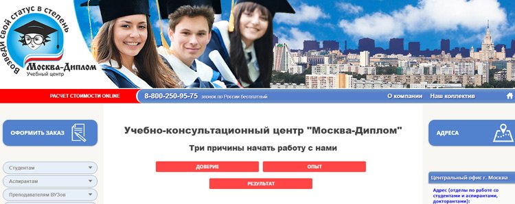 MosDiploma je jedna od najstarijih studentskih službi koja okuplja više od 200 savjetnika. Mnogi imaju akademske stupnjeve. Tvrtka pruža sve vrste usluga, uključujući pretraživanje materijala, pisanje radova bilo koje složenosti, dizajn teksta. Ovdje možete naručiti konzultacije o sudjelovanju u znanstvenim raspravama, okruglim stolovima itd. Stručnjaci će pripremiti sažetke za prezentaciju i polirati tekst. Cijene na web stranici nisu naznačene, izračunavaju se pojedinačno. Jedinstvene teme su skuplje. Stranke su obvezane ugovorom koji navodi detalje rada (iako nije objavljen na stranici). Jedinstvenost potvrđuje i program Antiplagiat University.