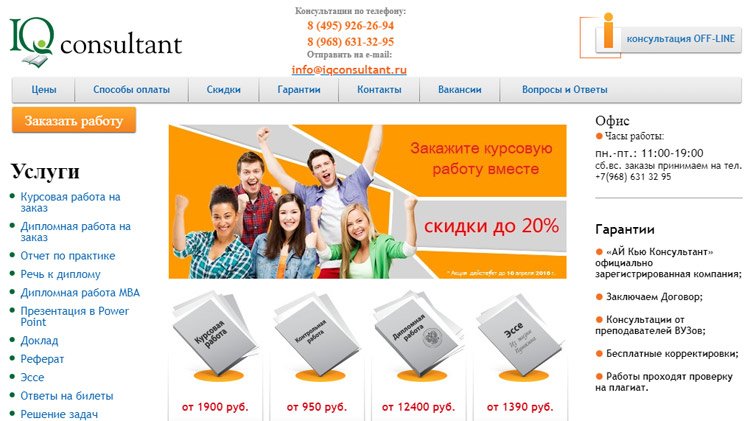 Vrijedno mjesto na ljestvici zauzela je IQ Consultant, koja je okupila članove fakulteta za pisanje radova na 45 predmeta. Upravitelj brzo pronalazi prikladnog autora i vodi projekt do kraja. Približan trošak teoretskog dijela je 1 900 rubalja, teza će koštati 15-17 000 rubalja. Izvođač dobiva do 12 dana za tekst, moguće je skratiti na 5 dana uz dodatnu naknadu. Stranica kaže da sveučilišta priznaju jedinstvenost od 65%, IQ Consultant se rukovodi ovim pokazateljem.
