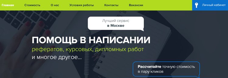 Svi su prošli prikupljene stotine stručnjaka iz različitih tema, pomažući pronaći najboljeg izvođača. Ocjene, cijene i recenzije dostupne su klijentima, a na aplikacije prijavljuje desetke ljudi. Najrazvijeniji bonusni program radi ovdje: na svakih 1500 rubalja, klijent vraća 100 rubalja. Stranica zahtijeva 100% pretplatu, koja je zamrznuta u bilanci prije završetka posla. Ako izvođač ne uspije, novac se vraća. Svaki tekst ima jamstvo: 28 dana za diplome, 21 dan za tečaj i kontrolu, 14 dana za esej. U ugovoru se navodi da uprava nije predstavnik stručnjaka, te stoga ne snosi obveze za usluge. Ali može riješiti kontroverzno pitanje.