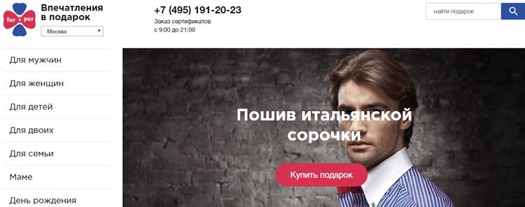Web-mjesta certifikata pružaju nezaboravne emocije iz gotovo svake sfere. Ove online trgovine izgradili su partnerstva sa stotinama tvrtki, omogućujući vam da ugodite prijateljima i rođacima s nekoliko klikova mišem. Najbolje stranice nude poklone za muškarce i žene po cijenama dobavljača, bilo da se radi o odmoru u spa salonu, skoku padobranom ili potrazi za mališanima.