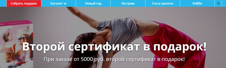 XPresent je postao drugi među najvrjednijim s velikim brojem poklon setova. Oni uključuju od 15 do 30 usluga, osoba bira jednu. Kupac može kupiti gotov certifikat ili prikupiti vlastiti. Dokument vrijedi godinu dana - duže od konkurencije. Za to vrijeme certifikat možete zamijeniti za bilo koju drugu osobu plaćanjem razlike u cijeni. Tvrtka nudi hitnu dostavu na dan narudžbe za 400 rubalja, inače kurirska služba košta 200 rubalja. (besplatno u ukupnom iznosu od 3.000 rubalja). XP poklonite poklon bonove za rođendan, Novu godinu, okrugli datum, kao i zanimljive opcije za muškarce, žene, djecu i zaljubljene parove.