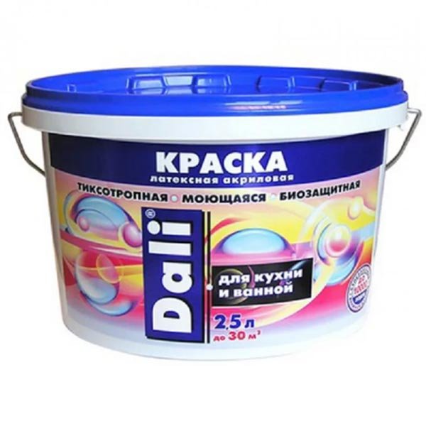 Dakle, Dali je imala takvu boju. Nije potrebno dugo vrijeme da se osuši, drugi sloj se može nanijeti unutar jednog sata nakon prvog. Nakon tri dana u potpunosti otkriva svoja zaštitna svojstva. Premaz ne mijenja boju pod utjecajem sunčeve svjetlosti, što je posebno važno za kuhinjske prostore. Kada temperatura padne, boja više ne bubri i ne puca. Osim toga, sastav je sada više ekološki prijateljski, proizvođač koristi manje toksičnih tvari u sastavu. Akrilna kiselina ispod boje stvara osjećaj filma na zidovima i stropu, čineći premaz izdržljivim i otpornim.