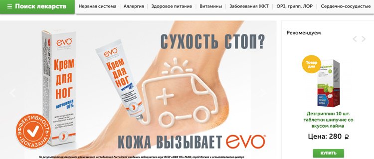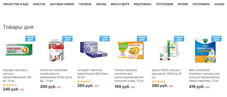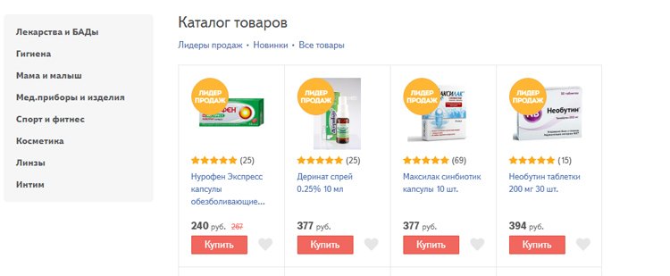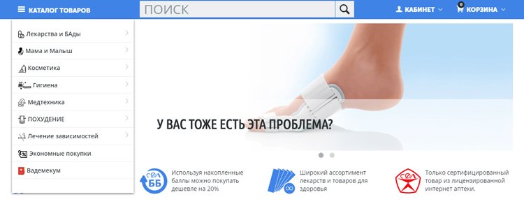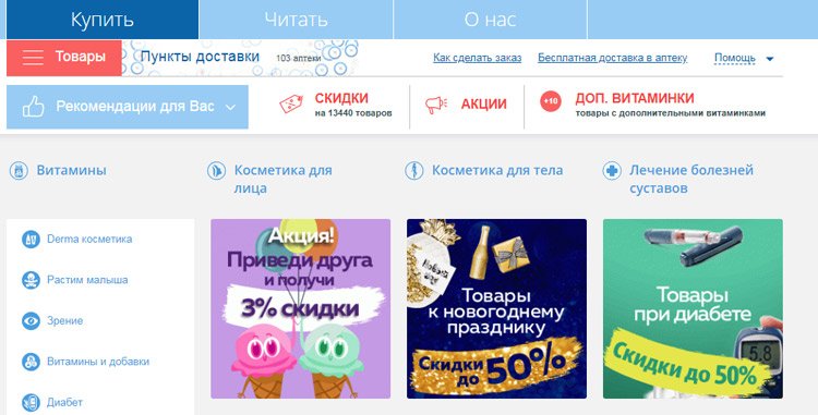 Otvara top tri najbolja ljekarna Online, na policama od kojih su lijekovi, posebna kozmetika, hrana i proizvodi za trudnice. Postoji odjeljak za djecu, ali je mnogo manji od konkurencije. Pozicije su podijeljene u kategorije i skupine. Za svaki proizvod unosi se kartica s detaljnim opisom i slikama. Međutim, nisu prikazani svi proizvodi. Stranica nudi popuniti kratki upitnik i dobiti 2% popusta, isti iznos će biti dodan za narudžbu vikendom i sretnim satima (od 20 do 8 sati). Redovni kupci mogu prikupiti do 10% bonusa. Većina proizvoda je na lageru, a nedostajuće stavke se uklanjaju s web-lokacije.