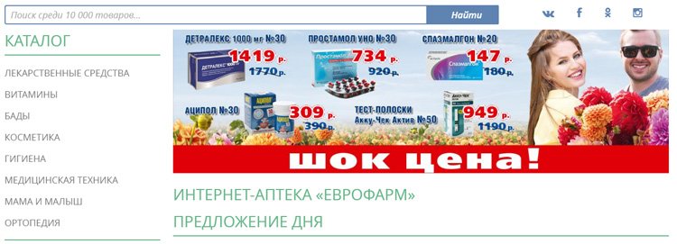 Eurofarm ima dobru reputaciju zbog vrlo stroge kontrole nad radom skladišta. Tvrtka je uspostavila partnerstva s dobavljačima, stranica sadrži više od 10.000 pozicija. Trgovina odmah privlači pažnju prikladnog i intuitivnog sučelja, lijekovi se traže za nekoliko minuta. Prilikom kupnje u iznosu od 1.500 rubalja ili više, kupac dobiva popustnu karticu. Redovito se održavaju promocije i popusti. Stručnjak je spreman pomoći s izborom, predložiti jeftiniji ekvivalent. Tvrtka prihvaća novac na bilo koji popularan način, osim elektroničkih novčanika.
