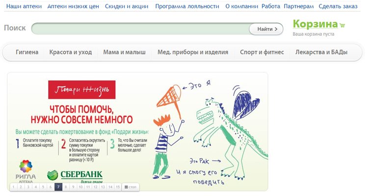 Mi nismo mogli dodati Riglu u rejting, jer mnogi pohvaljuju visoku kvalitetu usluge, a ljekarne se nalaze u svim krajevima Rusije. Na policama online trgovine nalaze se rijetki i popularni lijekovi, medicinski uređaji i dječji proizvodi. Postoje mali dijelovi s kozmetičkim i higijenskim proizvodima. Stranica ima lijepo sučelje, prikladne kartice s uvjetima kupnje robe. Na prvoj stranici nalazi se prodaja, a za ostale proizvode možete birati popust. To ovisi o bonusima i dodjeljuje se samo sudionicima programa Rigla - Svyaznoy Club (kartica se izdaje u ljekarni). Muscovites su dostupni za isporuku dana u dan, ostatak će morati čekati od 5 do 7 dana. Narudžbe od 2.000 rubalja bit će besplatne.