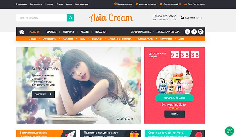 "Delicious", svijetlo asia-cream.ru nudi više od 3000 imena proizvoda za njegu lica, tijela i kose, kao i cijeli niz dekorativne kozmetike i izvrsnu liniju proizvoda za muškarce. Dopuna asortimana odvija se jednom tjedno, tako da se kupci mogu upoznati s novitetima korejske industrije ljepote, koje još nisu dostupne na drugim resursima. Svi proizvodi predstavljeni u prodaji su certificirani, što potvrđuje skeniranje dokumenata u odgovarajućem dijelu kataloga.