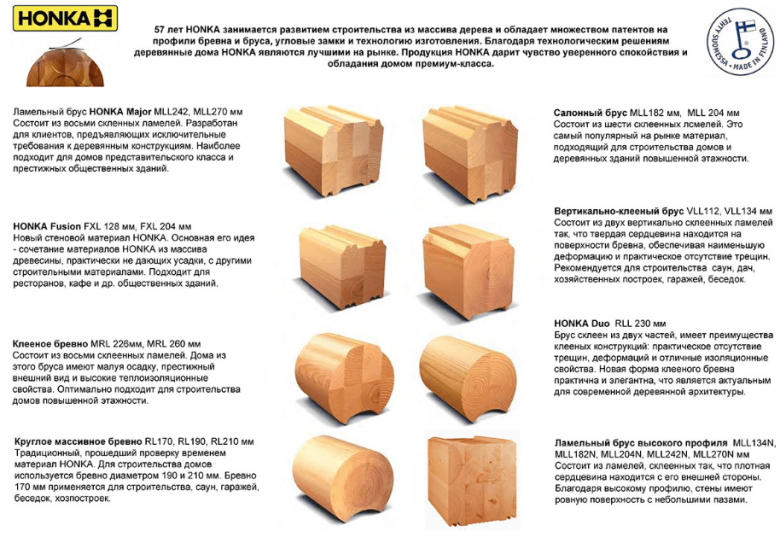 "HONKA" - najpoznatiji proizvođač ljepljenog lameliranog drva i dobavljač gotovih kućnih setova. Tvrtka gradi drvene kuće već više od 60 godina. Za to vrijeme uspjela je osvojiti apsolutno povjerenje potrošača. Zanimljiva je činjenica da čak i Engleska kraljica ima dom koji je izradila HONKA. Nema problema s naručivanjem drva ili kućnog seta - tvrtka ima predstavništva u 30 zemalja.