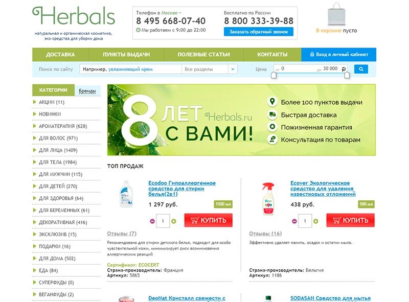 Online trgovina prirodne kozmetike Herbals već više od 8 godina pruža usluge prodaje raznih organskih proizvoda za ljepotu i zdravlje. Ovaj resurs odlikuje veliki asortiman od 3000 artikala i mnogo informativnih informacija o specijaliziranim temama. Ovdje možete pronaći zanimljive članke, recenzije i savjete o pravilnom korištenju bio-alata. Tvrtka prodaje proizvode raznih svjetskih brandova, međutim, časno mjesto u katalogu je upravo ruski razvoj stvoren na temelju istraživačkih instituta Ruske Federacije.