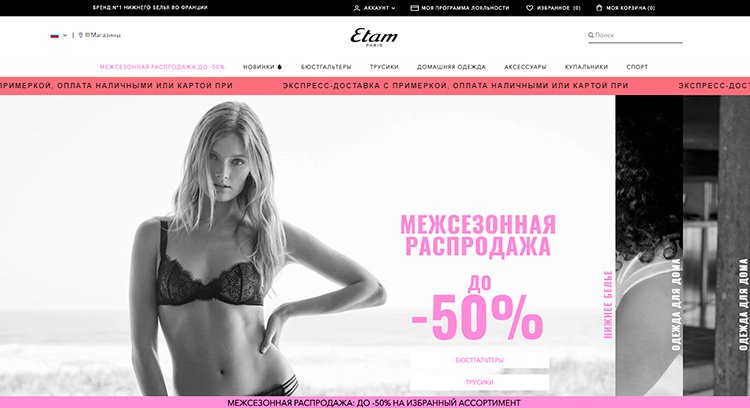 Etam je najstariji francuski brand donjeg rublja i kućne odjeće, vodeći brigu o ljepoti i udobnosti žena od 1916. godine. Službena internetska trgovina tvrtke otvorena je 2001. godine i tijekom proteklih gotovo 20 godina uspjela je poslužiti tisućama korisnika širom svijeta. Ako postavite Rusiju u postavkama mjesta, stranica će se automatski prebaciti na rusku verziju etam.ru-a, gdje možete jednostavno odabrati proizvod prema vrsti termina, obliku, boji, materijalu za šivanje i veličini.