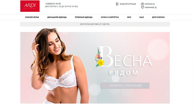 Stranica ardi.ru službena je platforma za virtualnu prodaju donjeg rublja istog naziva danske tvrtke. ARDI proizvodi proizvedeni su tradicionalnom tekstilnom tehnologijom i odlikuju se prirodnim sastavom, elegantnim dizajnom i udobnim rezom.Tijelo, grudnjaci i gaćice ovog proizvođača su nevjerojatno udobni za nošenje, zahvaljujući kojima zaslužuju ljubav modernih žena koje žele spojiti estetsku ljepotu s udobnošću.