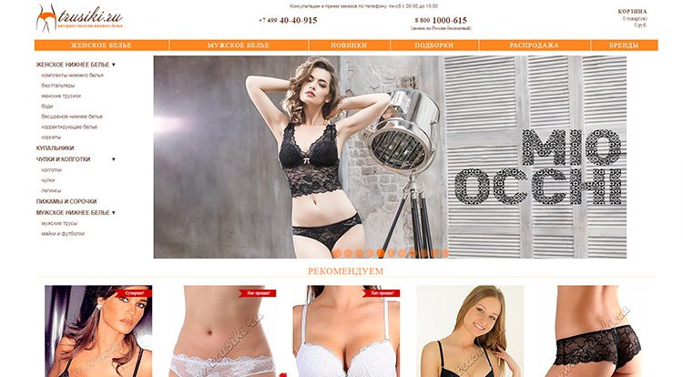 Sljedeći dućan s prilično neozbiljnim imenom Trusiki, ustvari, etablirao se kao potpuno vrijedan resurs, nudeći posjetiteljima više od 2000 modela kvalitetnog donjeg rublja i kućne pletenice poznatih svjetskih brandova. Katalog predstavlja proizvode različitih namjena i cjenovnih kategorija - od jeftinih i praktičnih “svakodnevnih” setova do ekskluzivnih artikala iz najnovijih modnih kolekcija.