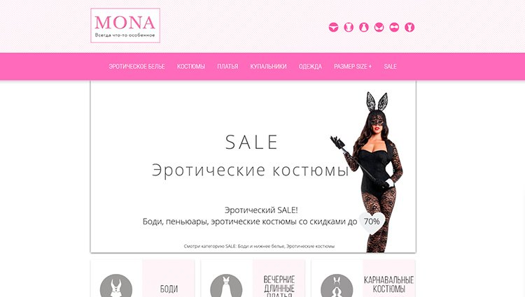 Osim toga, MONA nudi na prodaju elegantne večernje haljine, udobne kupaće kostime, lijepu odjeću za dom, korektivno donje rublje koje može sakriti neke mane figurica i sve vrste pribora potrebnih za stvaranje šarmantne i jedinstvene slike. Dimenzionalna mreža proizvoda posebno će zadovoljiti bujne ljepote tipa SIZE +. Za ove djevojke na mjestu postoji cijeli odjeljak u kojem se spajaju jedinstveni kompleti koji mogu svaku domaću pyshechku pretvoriti u pravu seks bombu.