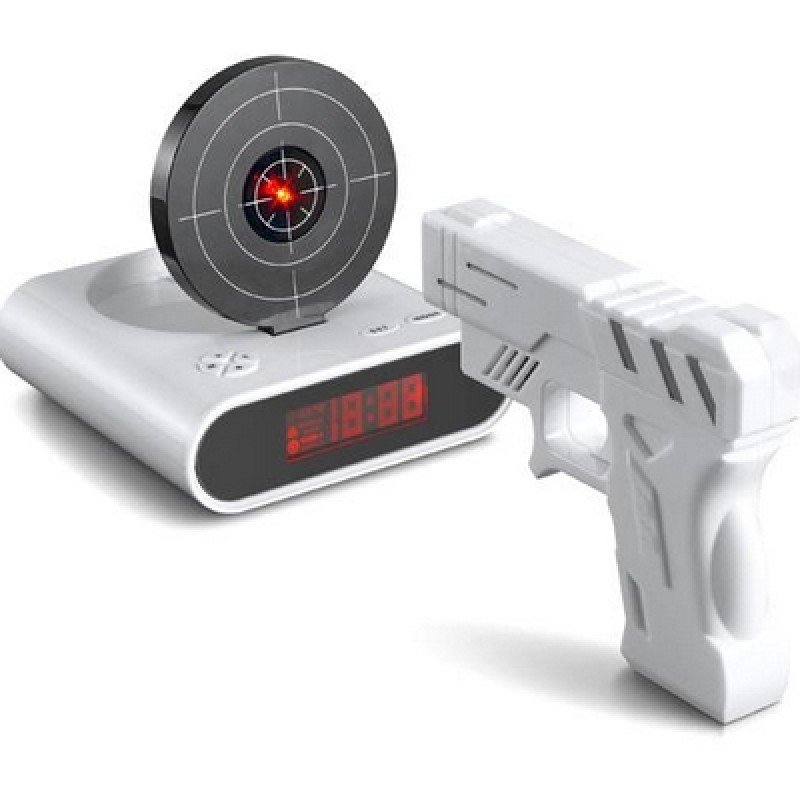 Ako je u jutarnjem razgovoru muž spomenuo da želi snimiti budilicu, dajte mu tu priliku - kao suvenir predstavite smiješnu budilicu s metom i laserskim pištoljem. Osobitost sata je da zvučni signal možete zaustaviti samo tako da udarite metu laserskim pištoljem. Ovakav način buđenja dati će zadatak živosti i dobrog raspoloženja za cijeli dan.
