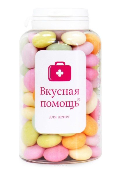 Skup slatkiša u kreativnom pakiranju ne može samo pružiti zadovoljstvo svakome tko voli slatkiše, već i pomoći u prevenciji i liječenju financijskih kvarova. Barem tako kaže proizvođač. Svatko tko iskoristi ovu slatku “pomoć” obećava povećanje plaća, niže kamatne stope za kredit, dobitke od lutrije i druge materijalne koristi. Naravno, takva su uvjeravanja komična u prirodi, ali ovaj ukusni i neobični dar je sasvim sposoban da vas nasmije i razvedri. Volumen plastične posude ispunjene slatkišima od marmelade je 250 ml. Okus slatkiša - voće. Također možete odabrati slične setove, ali s drugim željama.