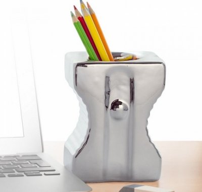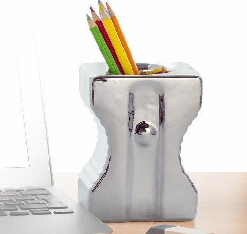 Desktop organizator, koji se koristi za pohranu tiskanice, mora imati dodatak za svaki ured i radno mjesto. U prodaji možete pronaći razne dizajne, od jednostavnog lakonskog stakla do luksuznih kompleta od prirodnog kamena s umetkom. Pokušajmo zadovoljiti određeni proračun i pronaći najoriginalniji štand koji se ne stidi prezentirati kao poklon. Na primjer, organizator u obliku velikog šiljila za olovke na stolu će izgledati vrlo organski. Zahvaljujući materijalu od kojeg je izrađen proizvod (keramika), takav suvenir ima vrlo uočljiv izgled, a stabilna podloga osigurava čvrstu vezu s bilo kojom horizontalnom površinom. Dimenzije postolja su 9,3 x 7,1 x 12 (cm), cijena je od 900 rubalja.