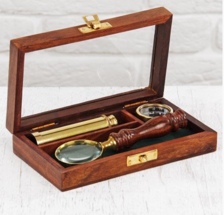 Hoće li vaš šef ili kolega sanjati o stvarnoj svjetskoj turneji? Onda ne može bez takvih potrebnih predmeta kao što su kompas, povećala lupa i sklopivi teleskop. Kombinacija prirodnog mahagonija i mjedi čini ovaj poklon set doista luksuznim i prezentabilnim. Takav suvenir će zasigurno zadovoljiti osobu s izvrsnim osjećajem za ljepotu, koja se voli okruživati lijepim i skupim eksponatima. I dok točni uvjeti odlaska nisu naznačeni, ovi atributi pruženog putnika moći će sami ukrasiti upraviteljev ured ili radno mjesto zaposlenika, dovodeći dugo očekivani odmor bliže. Čvrsto prozirno staklo postavljeno je u poklopac kutije, što omogućuje dobar pregled svih sadržaja, dimenzije paketa - 16,0 x 9,5 x 3,7 (cm).