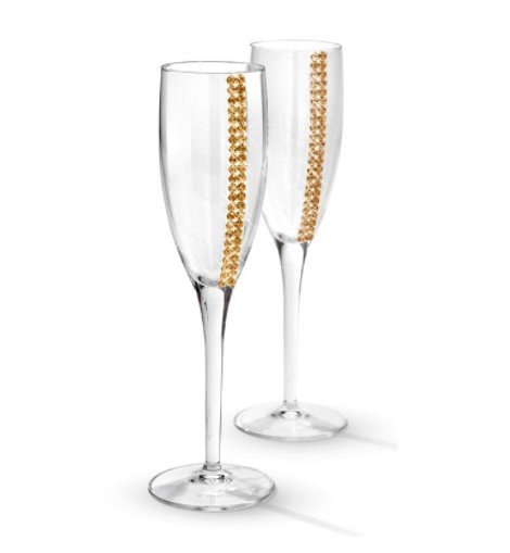 Tradicionalni dar za ceremoniju vjenčanja i naknadne obljetnice ovog događaja uvijek se smatralo skupom čaša za šampanjac. Dva luksuzna naočala talijanskih majstora, ukrašena pjenušavim kristalima Swarovski, bit će izvrstan dodatak svečanom stolu za večeru ili intimnu večeru za dvoje. Za lakši transport i skladištenje, posuđe se prikladno smješta u kutiju za poklone, koja štiti lomljive predmete od oštećenja. Čaše izgledaju vrlo elegantno, te su sasvim prikladne za ulogu luksuznog poklona, vremenski usklađenog s godišnjicom vjenčanja. Staklo je prozirno, boja ukrasnih kristala je zlatna.