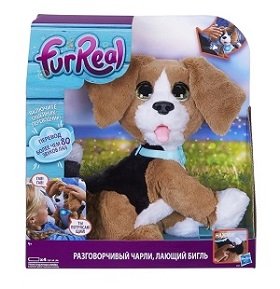 Charliejevo štene iz serije Furreal Friends iz Hasbroa ponaša se kao obični pas - može glasno lajati, ležati na šapama, pomicati uši i rep. Štoviše, zahvaljujući snimljenim frazama na ruskom (oko 80 komada), igračka može čak podržati razgovor na neki način. Ovaj originalni božićni poklon posebno je pogodan za djecu koja su navršila 4-5 godina starosti. Uz to, možete podučiti svoje dijete da se brine za vašeg ljubimca i pripremiti se za kupnju ove životinje. Igračka radi na četiri baterije tipa prst. Teži oko 1300 grama. Osim pasa, katalog marke obuhvaća robotske mačiće, majmune, zečeve, pande, hrčke, papige i smiješne vilinske zmajeve mladice.