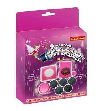 Tvrtka Bondibon proizvodi nekoliko vrsta kompleta za mlade čarobnjake. 6-godišnja djevojka najbolje odgovara skupu "9 magičnih trikova za zabavu broj 6", koja sadrži sve potrebne detalje za devet nevjerojatnih izvedbi i upute s detaljnim opisom. Sve komponente igre izrađene su od visokokvalitetne plastike, razina složenosti je srednja.