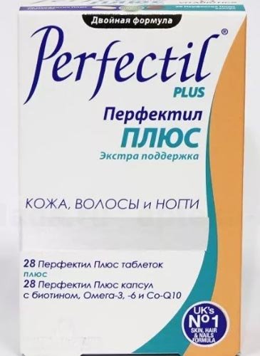 Komplet "Perfectil" engleske proizvodnje sastoji se samo od prirodnih korisnih komponenti. Njezin sastav uključuje askorbinsku kiselinu, silicij, jod, željezo, biotin, folnu kiselinu, ekstrakte čičaka, ehinaceje, itd. Utjecaj minerala, vitamina i biljnih tvari dovodi do zamjetnog rezultata nakon nekoliko tjedana. Žene slave brz rast kose, sjaj i snagu noktiju, izravnavanje tonusa kože i sjaj. Lijek također pomaže protiv gubitka kose.