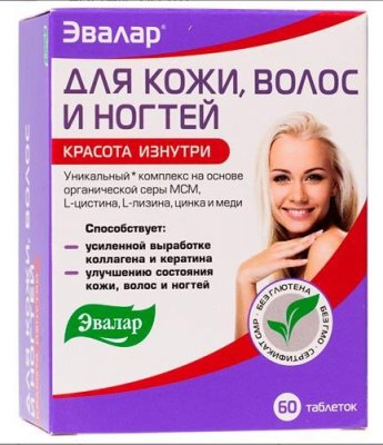 Dostupno u tabletama koje se uzimaju 2 puta dnevno. Jedna boca sadrži 60 komada, tj. to je dovoljno za cijeli tijek prijema. Ima puno dobrih recenzija, gdje govore o visokoj učinkovitosti i primjetnom rezultatu. Prednosti: poboljšava kožu (eliminira piling i upalu), ojačava nokte, smanjuje gubitak kose i povećava rast kose, najbolje ocjene žena, dobar sastav. Nedostaci nisu pronađeni.