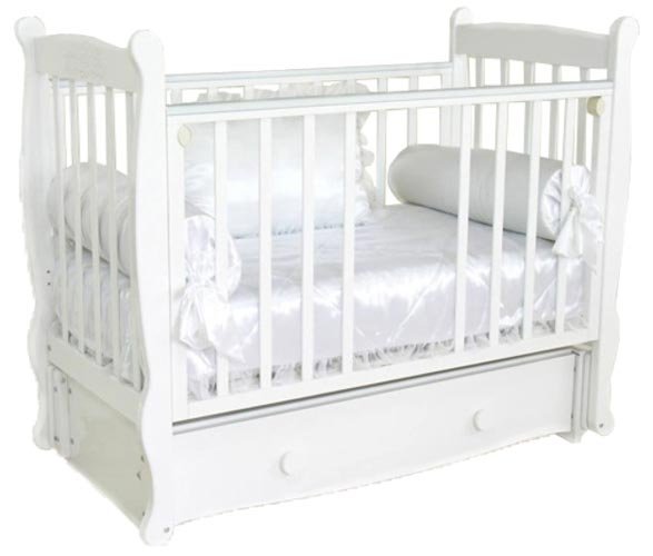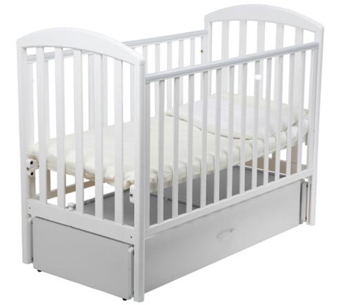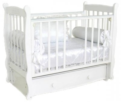 Lijepa, vrlo slatka bijela postelja od prirodne bukve. Ima klasičan dizajn - pravokutnog oblika, zidne rešetke, čvrste naslone. Za praktičnost, postoji jedna prilično prostrana ladica za spremanje dječje odjeće. Leđa su ukrašena slatkom slikom medvjeda, dodatno možete kupiti kupolu. Postoje vodilice za brzo ljuljanje beba i kotači s čepom za jednostavno pomicanje kreveta. Zbog velike veličine (82x139x120 cm), dijete može spavati u ovom krevetiću 4-5 godina. Prednji zid se spušta ako je potrebno.