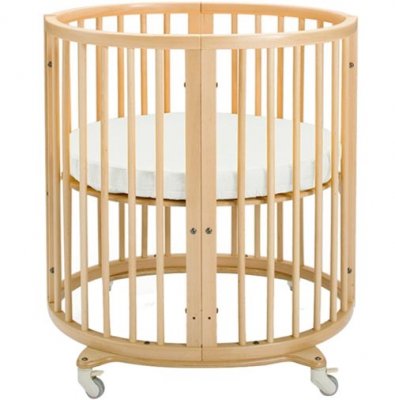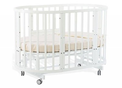 Krevetić za novorođenčad lijep i moderan okrugli oblik osvojio je vodeću poziciju na ljestvici. Izrađuju se u nekoliko boja: bijelo, svijetlo ili tamno drvo. Proizvodni materijal - dobro obrađeno prirodno drvo. Sve komponente su izrađene savršeno. Značajka modela - dodavanjem dodatnog dijela, može se povećati u duljinu, napraviti ovalni. Veličina je prilično velika - dijete će u njemu moći spavati sve do svoje sedme godine. Zatim se krevet može lako rastaviti na tri dijela, pretvarajući se u stol i dvije polukružne stolice.Unatoč svim opisanim prednostima, mnogi korisnici vjeruju da je cijena temeljito visoka.