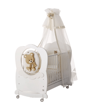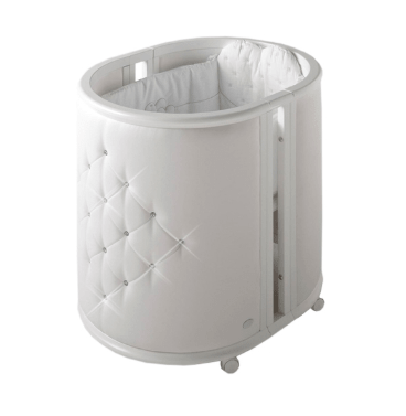 Jedinstveni transformatorski krevet talijanskog proizvođača luksuz je od prvih dana života. Isprva obavlja funkciju ugodne kolijevke, a kada dijete malo raste, postaje udoban krevet. Ovalni oblik bez oštrih kutova, pokrivanje mekom eko kožom čine ga apsolutno sigurnim za bebu. Vani su mekani bijeli zidovi ukrašeni izuzetnim Swarovski kristalima. Drveni elementi izrađeni su od kvalitetne obrađene bukve.