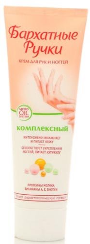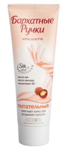 Marka "Velvet hands" smatra se jednom od lidera na rang listi najboljih u nekoliko kategorija odjednom. Ova krema obilno omekšava kožu ruku, oslobađa od suhoće i ispunjava hranjivim elementima. Nakon crtanja vidljivo je izglađen. Među sastojcima je shea maslac, poznat po svojim jedinstvenim svojstvima. Redovita upotreba alata s njim čini ruke bolje njegovanim, lijepim i ugodnim na dodir. Usprkos niskoj cijeni, ima visoku učinkovitost. Na to ukazuju brojne recenzije kupaca. Kompozicija je također obogaćena provitaminom B5 i uljem avokada, koji u kompleksu djeluju vrlo intenzivno.