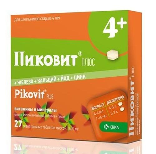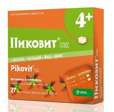 Tablete za žvakanje s okusom banane Pikovit Plus sadrže 12 vitamina i 4 elemenata u tragovima u sastavu. Dizajniran za djecu od 5 godina. Preporučuje se za nedostatak vitamina i minerala. Korisnici preferiraju ovaj dodatak prehrani kada je riječ o djeci od 6 i 7 godina, ako je osim smanjenja vjerojatnosti bolesti, zadatak i jačanje tijela budućeg studenta. To je vrsta adaptogena koji pomaže da se naviknete na rastuće opterećenje.