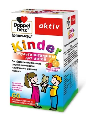 Multivitamini za djecu Doppelgerc Kinder dostupni su u obliku tableta za žvakanje - marmelada s okusom maline. Dizajniran za pun razvoj djeteta. Kompenzirajte nedostatke vitamina. Prema korisnicima, oni ne sadrže umjetne boje i konzervanse. Odobren za uporabu od 4 godine, ali najčešće se ovaj vitaminski kompleks stječe za djecu predškolskog i osnovnoškolskog uzrasta - 6-7 godina. Uzmite 1 tabletu za žvakanje dnevno. Kontraindikacija - individualna netolerancija.