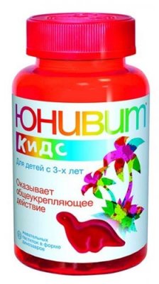 Univit Kids lizalice za žvakanje dizajnirane su da podrže imunitet u djece od 3 godine starosti. Korisnici pozitivno ocjenjuju ovaj kompleks vitamina (A, B3, B6, B12, C, D3, E). Marmelade u obliku dinosaura s okusima maline i naranče vrlo su atraktivne u očima djece 4 i 5, pa roditelji ne moraju uvjeriti dijete da uzima vitamine. U pregledima je također navedeno da je poklopac opremljen zaštitnim mehanizmom protiv djece. Jedna doza na dan je još jedan značajan plus. Po završetku liječenja možete računati na povećanje imunološke otpornosti tijela i na opći učinak jačanja.