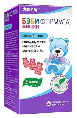 Baby formula "Medvjedi" iz Evalara označena je oznakom "Najbolje za djecu". Žvakanje paste "Smirenost" je kompleks koji podržava živčani sustav. Značajka vitamina - sastav, uključujući glicin, metvicu, magnezij, matičnjak i ostale sastojke. Kompleks preporučuju stručnjaci za hiperaktivnu djecu od 3 do 7 godina. Kao posljedica recepcije, uočavaju se normalizacija sna, poboljšanje mentalnog učinka, smanjenje razdražljivosti. Važna točka - kompleks ne sadrži gluten i "kemiju".