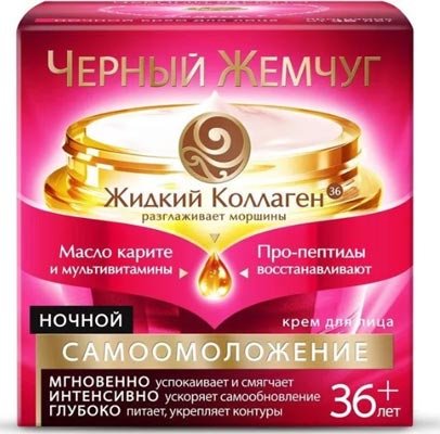 Black Pearl Self-Positioning noćna krema sadrži tekući kolagen - korisnu tvar stvorenu za izglađivanje bora i poboljšanje kontura lica. Nježna tekstura omogućuje da se krema brzo upije i ugodno ode na kožu. Ne ostavlja masnu i skriva malu crvenilo. Još jedna pozitivna točka proizvoda je izvrsna zaštita od UV zraka. Recenzije kupaca kažu da gotovo odmah krema ima vidljiv učinak - čini kožu sjajnom i čini je elastičnijom. Alat je pogodan za žene nakon 46 godina.