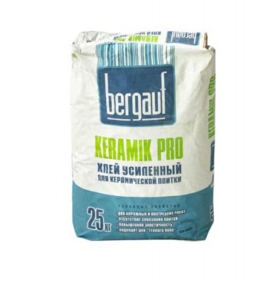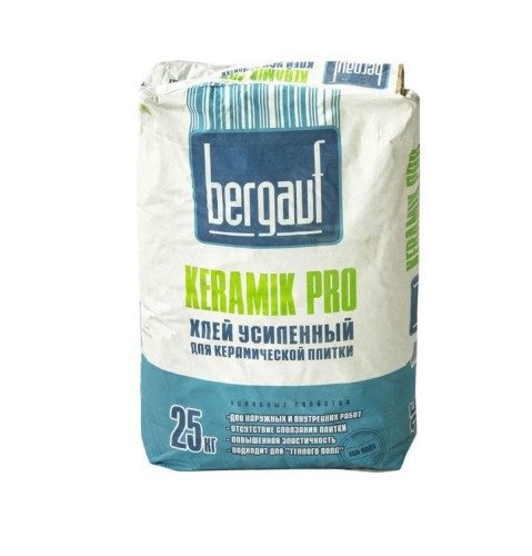 Sigurno drži razne materijale za pločice Bergauf Keramik Pro ljepilo. Njegova posebnost je visoka elastičnost šava nakon sušenja. Kompozicija je u stanju držati dugi niz godina, kao standardne keramičke pločice, i moderan klinker, prirodni ili umjetni kamen. Ljepilo zadržava svoje kvalitete u širokom rasponu temperatura (-50 ... + 70 ° C), što omogućuje da se koristi za vanjske radove ili za oblaganje grijanog poda. Udobno se osjeća kao sušeni šav u vlažnim uvjetima, pa je također prikladan za tuš ili kupaonicu.