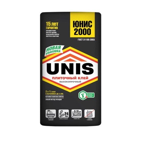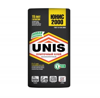 Rusko ljepilo Unis 2000 namijenjeno je za polaganje pločica u suhim i vlažnim područjima. Prednosti proizvoda su visoka adhezivnost i brzo sušenje. Nakon dana na pločici, možete hodati, a ostaci suhog ljepila u spojevima pločica neće biti lako ukloniti bez posebnih sredstava. Stručnjaci bilježe održivost pripremljenog maltera (3 sata), dovoljno vremena za podešavanje pločica (20 min), kao i širokog raspona debljina (2-15 mm). Stoga će u sposobnim rukama, keramici, porculanu, kamenu ravnomjerno stati na nepripremljene površine.