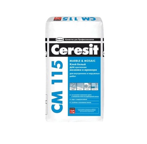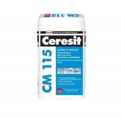 Mnogi majstori smatraju da je sastav Ceresit CM 115 najbolji ljepilo za pločice za mramor ili mozaik.Ova idealna bijela boja šava nakon sušenja je njegova glavna prednost. Stoga, mješavina ne mrlja na pločama od svijetlog kamena, mramora ili prozirnog mozaika. Osim ove imovine, stručnjaci ističu takve pozitivne aspekte ljepila kao što su ekološki prihvatljivi, mogućnost montaže na toplom podu, korištenje za vanjske radove i otpornost na vlagu. Pripremljena otopina zadržava svoju sposobnost preživljavanja 2 sata, a početno podešavanje nastupa nakon 25 minuta. Debljina ljepljivog spoja treba biti od 4 do 10 mm, a onda se pločica ne može skliznuti s vertikalnom ugradnjom.