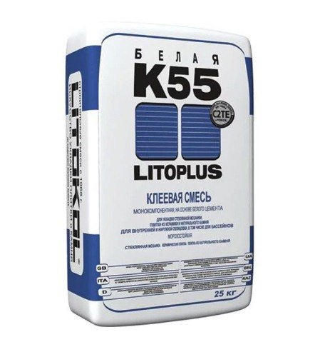 Suhi sastav ljepila Litokol Litoplus K55 izrađuje se na bazi bijelog cementa. Zahvaljujući ovoj formuli, pogodna je za lijepljenje prirodnog bijelog kamena, prozirnog i obojenog mozaika. Stručnjaci smatraju da je visoka tiksotropija posebna značajka proizvoda, zbog čega materijali za pločice ne klize po vertikalnim temeljima. Uz pomoć ljepila moguće je obavljati vanjske radove, budući da je temperaturna granica rada -30 ... + 90 ° S. Prikladna mješavina za polaganje pločica na toplom podu. Hodanje po novim pločicama je moguće nakon jednog dana, a puni rad je moguć nakon 14 dana izloženosti.