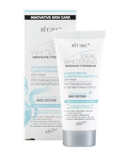 Korektor seruma VITEX IDEAL WHITENING Beloruska proizvodnja je usmjerena akcija protiv pigmentnih mrlja, vaskularnih zvijezda i pjegica. Namijenjen je izbjeljivanju i izravnavanju tonova kože. Paralelno, djeluje hidratantno i doprinosi regeneraciji pokrova. Ekstrakt medvjeda je odgovoran za sjaj i zdravlje, a limunska kiselina osigurava učinak mekog ljuštenja. Mjesec dana nakon uporabe, sudeći prema pregledima kupaca, rezultat počinje biti vidljiv. Pigmentne mrlje postaju manje, a upalni procesi prolaze. Također, alat se aktivno bori s aknama i crnim točkama.