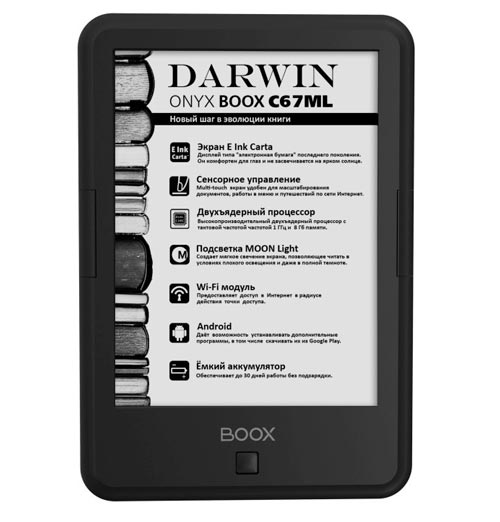 ONYX BOOX C67ML Darwin podržava većinu formata. E-knjiga se može koristiti za pristup internetu zbog ugrađenog preglednika i praktičnog zaslona osjetljivog na dodir. Komplet sadrži zaštitni poklopac s "pametnom" funkcijom - kada zatvorite knjigu, automatski prelazi u stanje mirovanja. U pregledu, mnogi vlasnici upućuju na ugodan zaslon osvijetljen sa zaslonom, lijep i praktičan slučaj.
