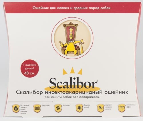 Ogrlica za pse Scalibor - univerzalni lijek za sve vrste parazita. To je odbijajući (odbija miris) i bori se protiv kukaca nakon ugriza, uzrokujući paralizu. Posebna tvar deltametrin aktivno odbija krpelja, buhe, a da se ne apsorbira u kožu životinje. Formula sigurna za pse - glavna značajka Scalibora.