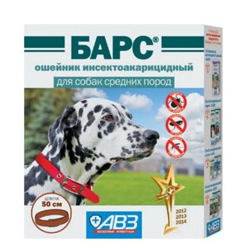 Ogrlica od domaće tvrtke "Barovi" - pouzdan branitelj od parazita. To je odbijajući, što uvelike poboljšava učinkovitost. Sprječava razvoj zaraznih bolesti u životinja. Ogrlica zauzima vodeću poziciju na ljestvici, jer ima najbolju kombinaciju cijene i kvalitete. Ova jeftina opcija s izravnim izgledom štiti psa od buha, krpelja i drugih opasnih insekata.Trajanje upotrebe do 2 mjeseca. Još jedna prednost je otpornost na vlagu. Djelovanje se temelji na tvari fipronil.