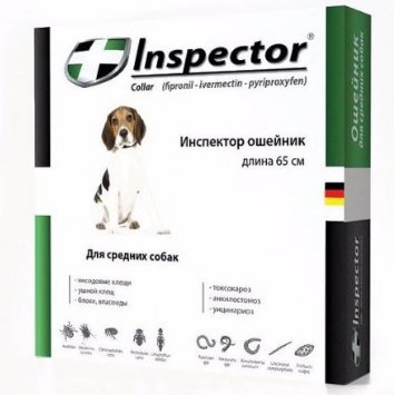 Inspektor se liječi aktivnim tvarima koje se oslobađaju s površine ovratnika i apsorbiraju u kožu psa. Oni se nakupljaju u kosi, lojnim žlijezdama i folikulima kose, a zatim djelomično apsorbiraju u krv. Formula utječe na živčane i mišićne stanice parazita, što dovodi do njihove spore smrti. Sadrži ivermektin i fipronil, koji su poznati po tome što blokiraju receptore grinja i ušiju. Ovratnik se preporučuje za stalno nošenje, zaštita traje do 4 mjeseca. Istodobno, ona djeluje na upravitelje samo prvih 8 tjedana.