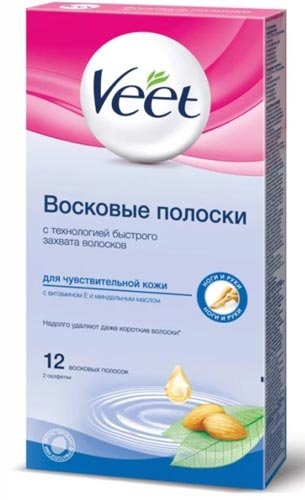 Brand Veet, naravno, prvi u popularnosti među voskom trake. Tvrtka ih proizvodi već više od 80 godina. Stečeno iskustvo pomoglo je u stvaranju lako dostupnih proizvoda s visokom učinkovitošću. Za ovu kombinaciju robe i pogodak ocjena. Ocjene kupaca pokazuju da Veetove trake za uklanjanje dlačica, kada se pravilno koriste, uklanjaju kosu, zadržavajući rezultat 3-4 tjedna. Korisno ih je koristiti zbog posebnog obrasca. Vosak je dizajniran da zadovolji zahtjeve osjetljive kože, stoga su uključena ulja i vitamini. Alat ne uzrokuje alergije, suhoću i druge neugodne posljedice. Komplet sadrži 12 traka i 2 salvete. Veet dizajniran za svaku zonu, uključujući bikini.