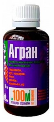 Visoka koncentracija emulzije "Agran" je profesionalni alat dizajniran za ubijanje stjenica, mrava, ose, žohara, krpelja. No, zbog svog univerzalnog sastava i pristupačnosti, često ga koriste nespecijalne usluge. Jedna boca ima volumen od 50 ml. Ovaj iznos je dovoljan za obradu nekoliko soba, a ponekad i cijelog stana.Dobre ocjene kupaca ukazuju na to da lijek stvarno eliminira parazite, a također je i ekonomičan kada se koristi. Glavna prednost je utjecaj na jaja kukaca. Može imati negativan utjecaj na osobu, kućne ljubimce, tako da tijekom obrade treba paziti da se pridržavate mjera opreza.
