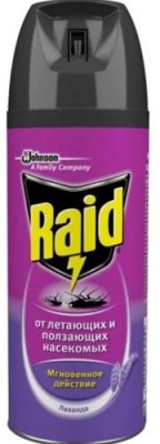 Raid aerosol ima univerzalni učinak, usmjeren na veliki broj različitih insekata (buha, mrava, moljaca, žohara), uključujući stjenice. 300 ml tuba uništava insekte na velikom području. Jedinstvena formula omogućuje brzo uklanjanje štetnih nametnika. Nakon tretmana, potrebno je prozračiti stan i po mogućnosti ne ulaziti 3-4 sata Važna prednost je sigurnost za ljude. Prilikom upotrebe proizvod treba prskati na predmete, namještaj, zidove i druge površine, ali ne u zrak. Samo nekoliko sekundi je dovoljno za obradu 30 cm radnje.